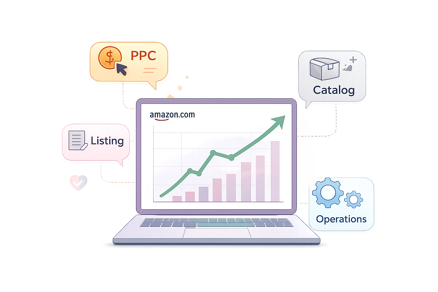 We manage your brand end-to-end on Amazon, from listings and PPC to pricing, inventory, and growth strategy. Our goal is to scale your revenue while protecting long-term brand health.